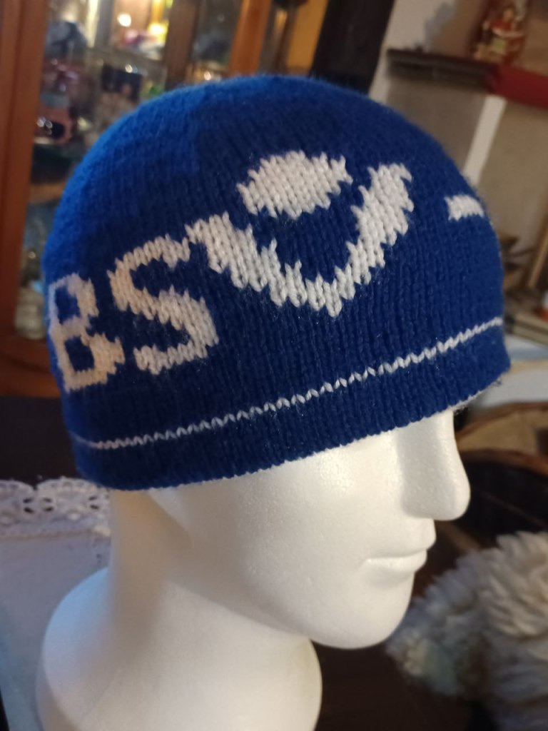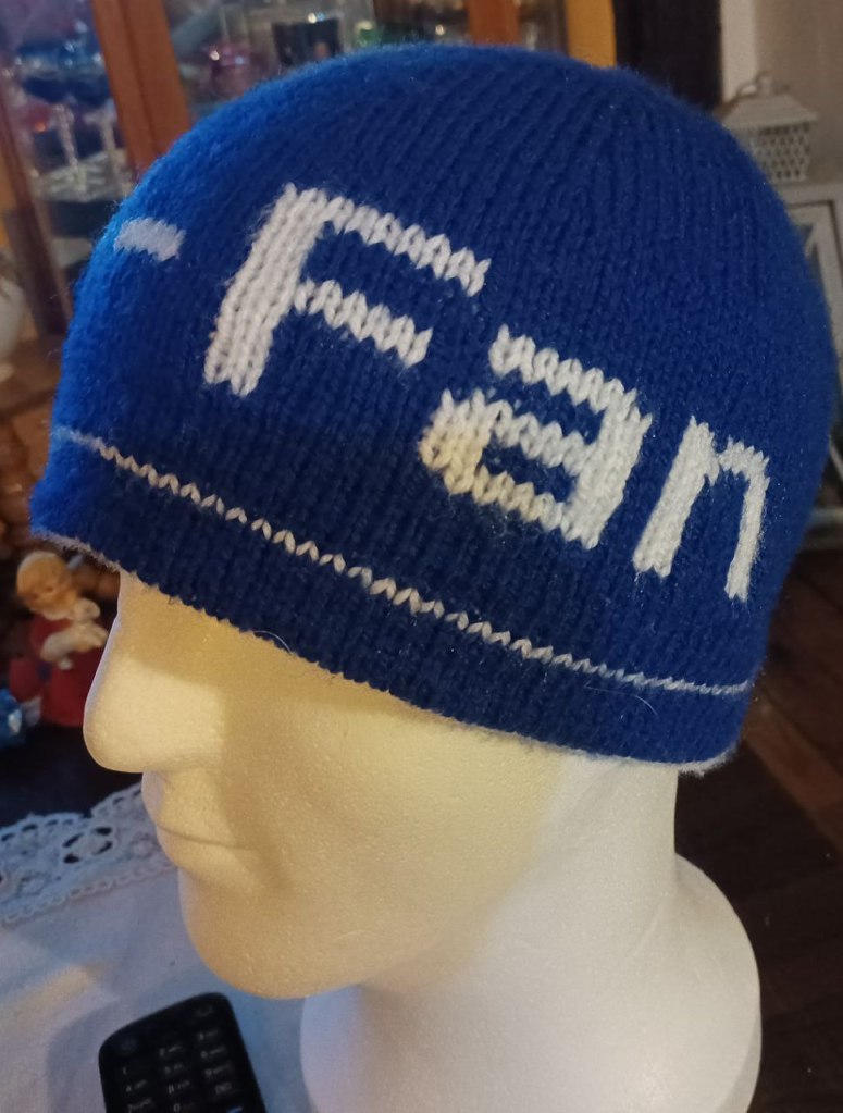 Diese Mütze ist individuell gestaltet. Man könnte sie auch wenden, nur ist da die Schrift spiegelverkehrt-